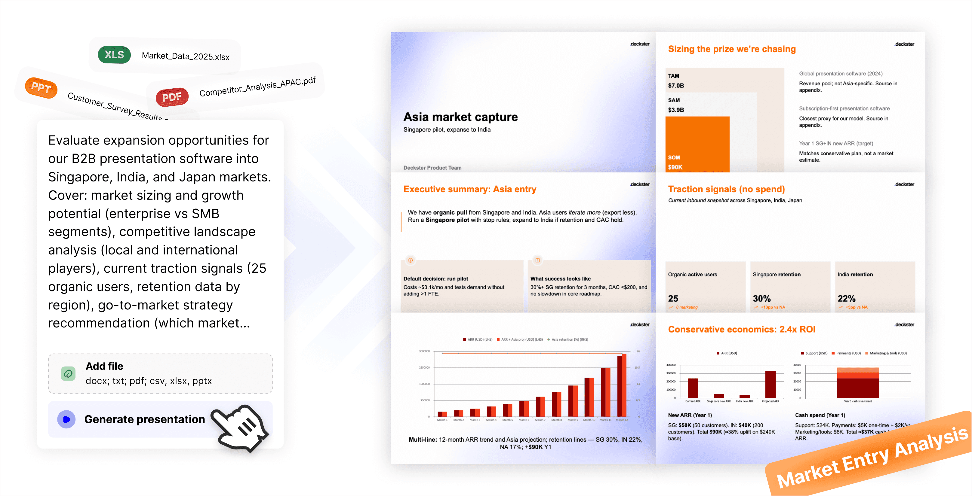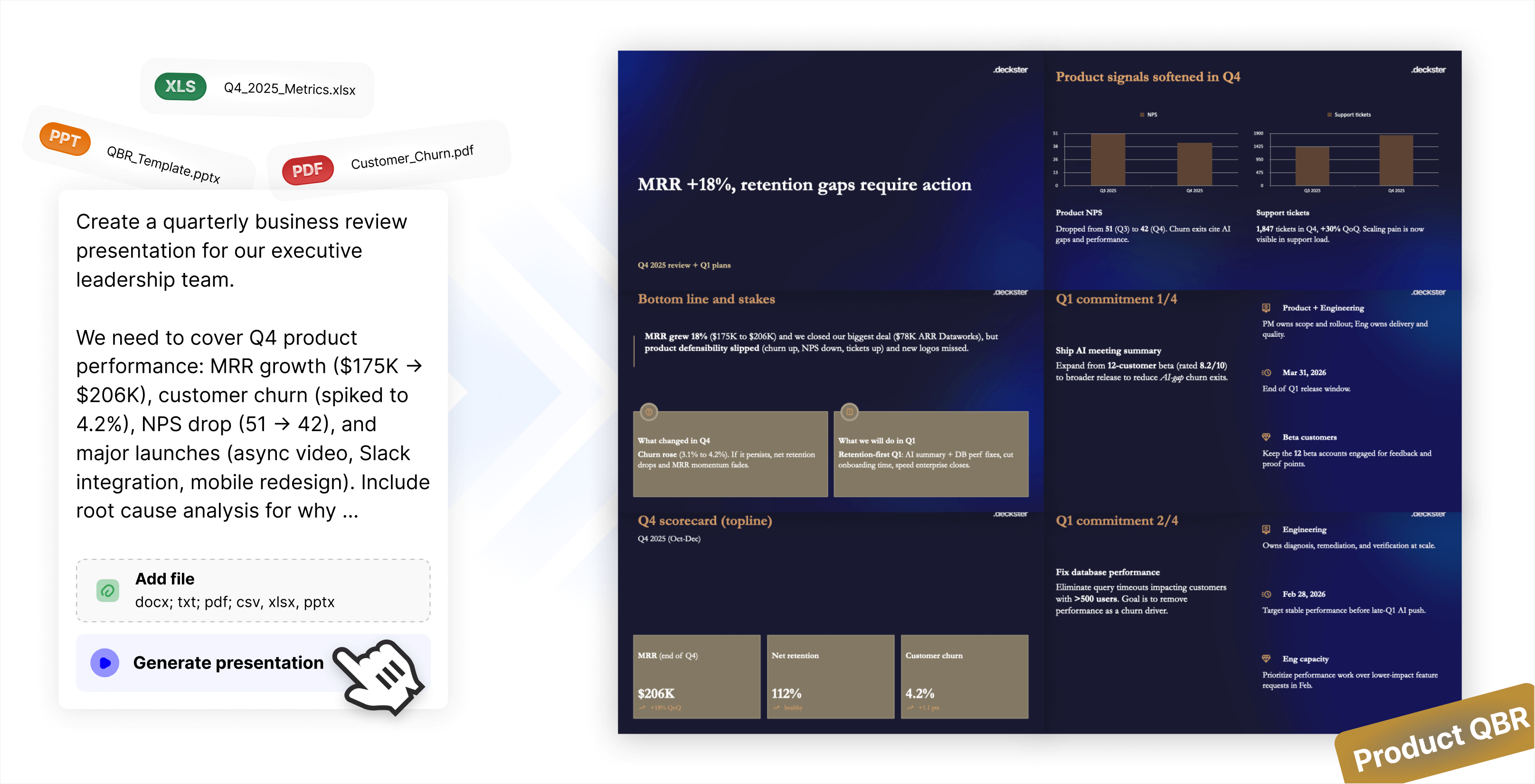 Deckster generates structure, narrative flow, and initial content. Charts auto-created from your data. Frameworks embedded. Not perfect - that's intentional. You'll iterate to 100%.