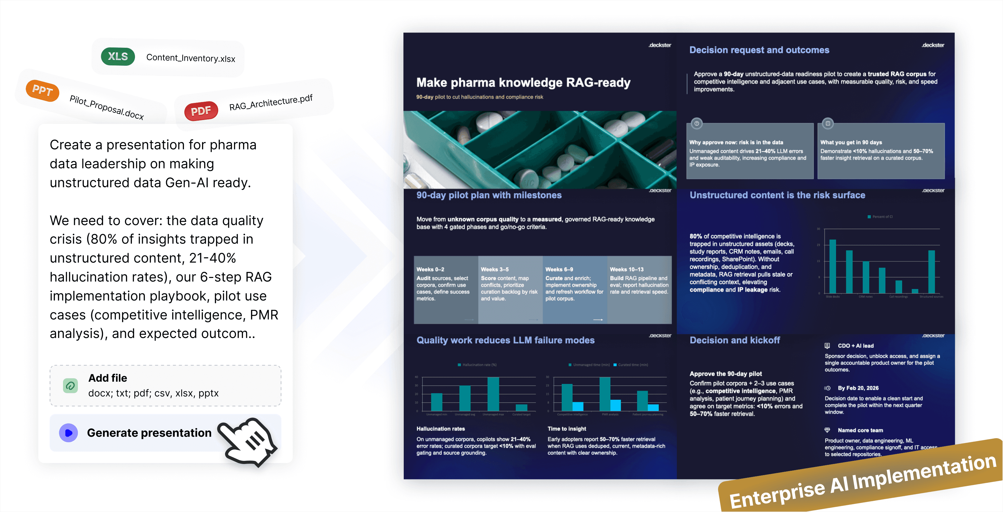 Deckster generates charts from your data files or web sources - contextual, narrative-driven charts that support your argument, not just decorate slides.