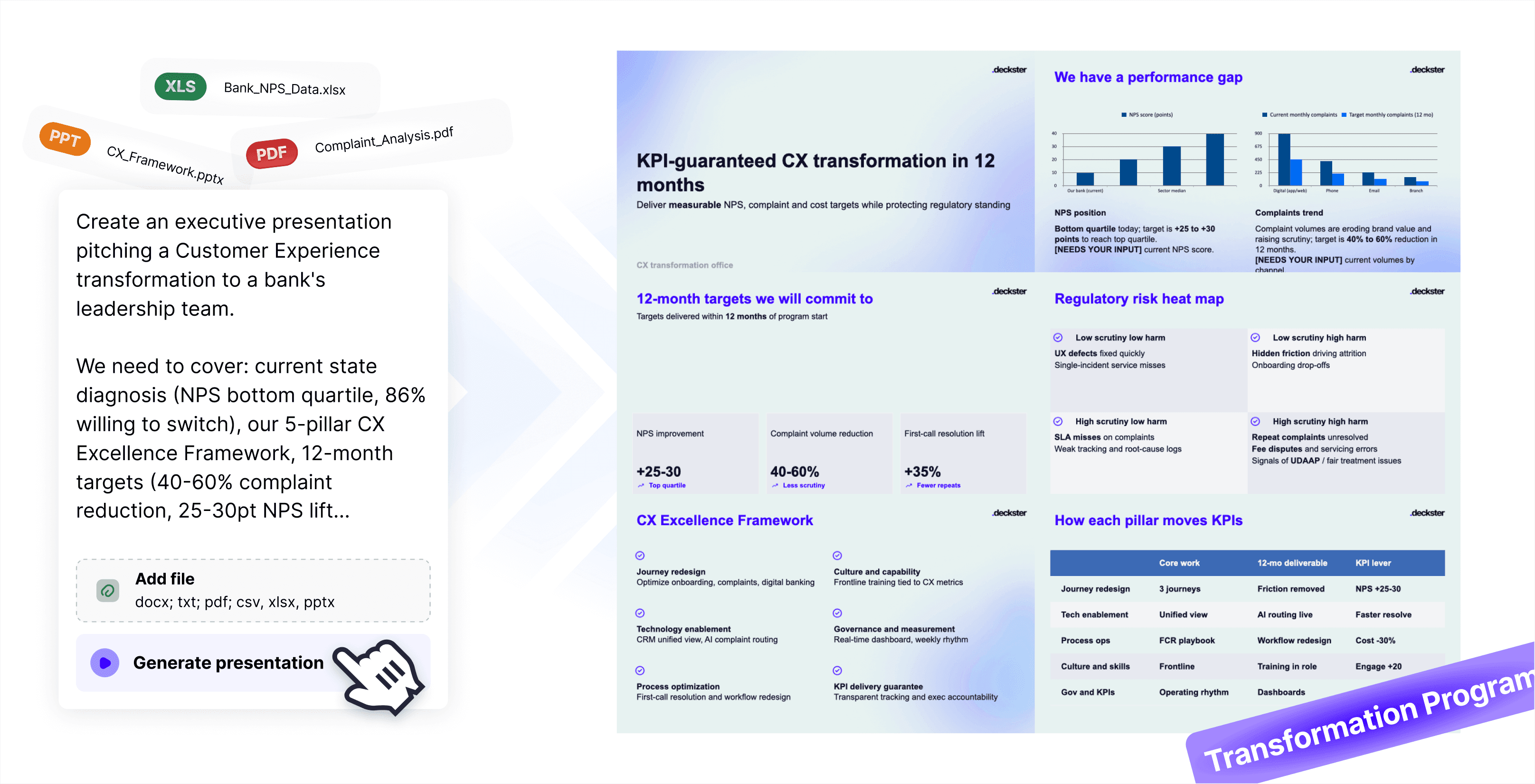 Just tell Deckster what you're working on - paste notes, upload documents, or describe your idea. Deckster analyzes your input, detects the audience and presentation type automatically, and asks clarifying questions to fill in any blanks. Within 5-10 minutes, you get a structured draft with auto-generated charts and analysis. Then refine: regenerate slides, adjust structure, swap visuals, edit content. Export to PowerPoint or Google Slides when you're ready for final touches.