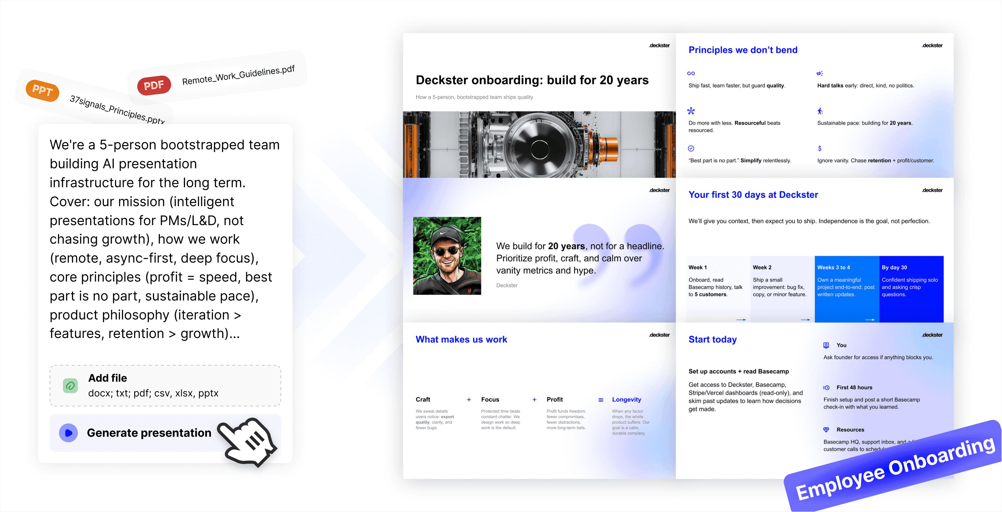 Tell Deckster what you're working on - your goal, who you're presenting to, any key details. Upload files if you have them.