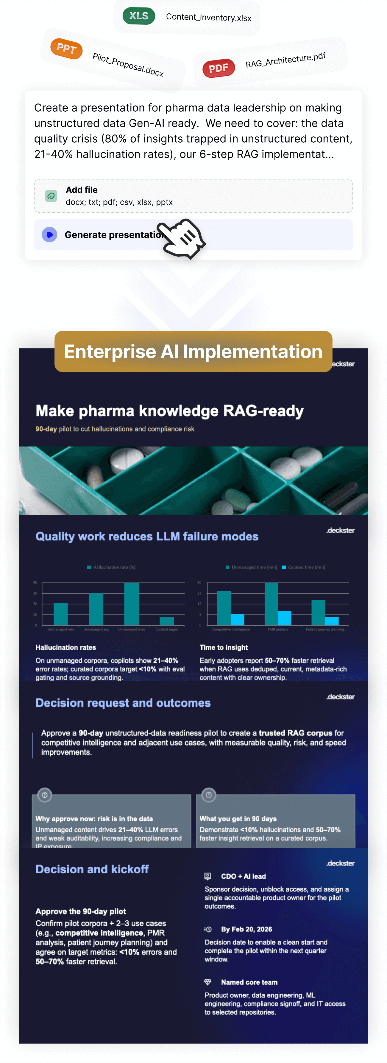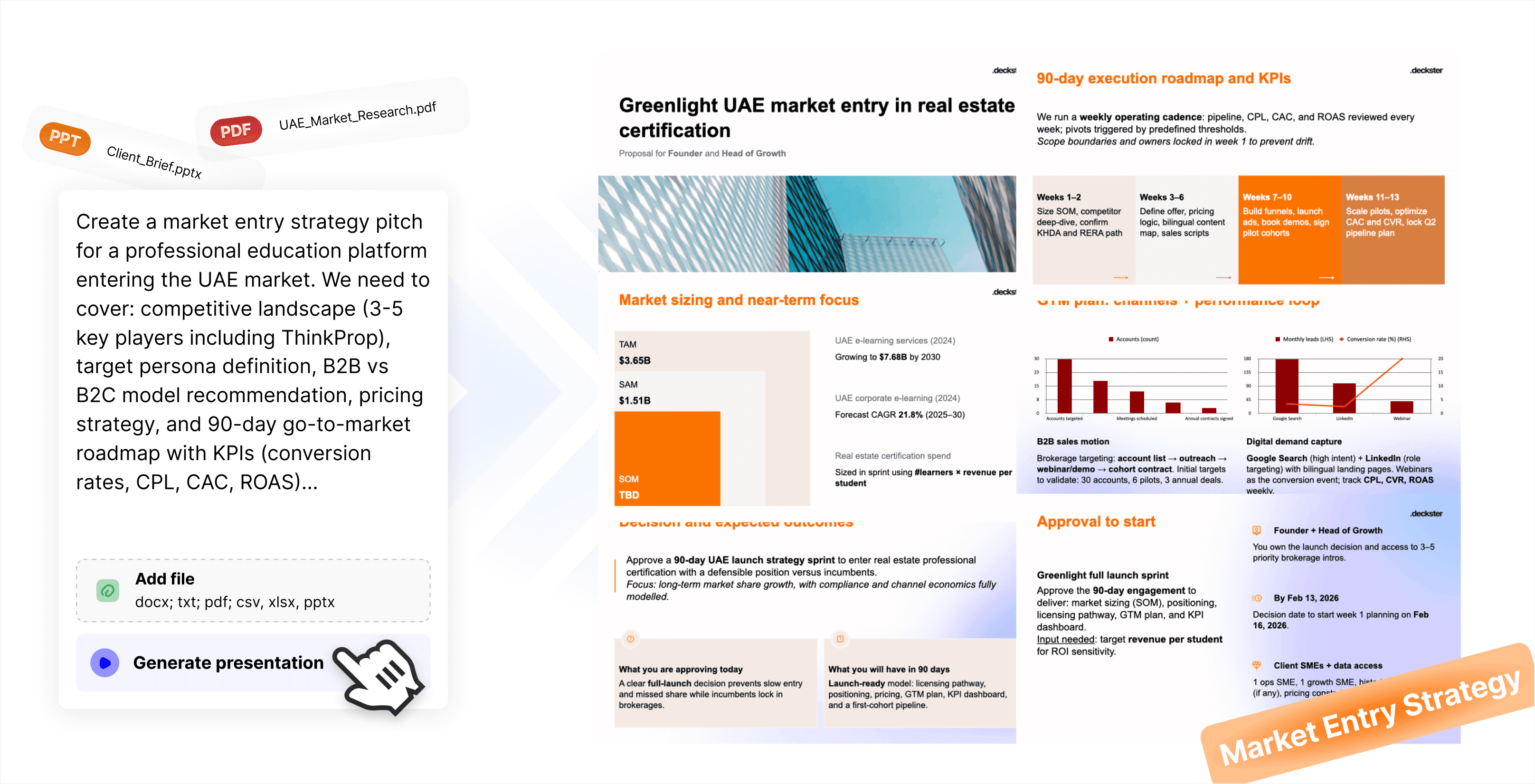 Tell Deckster what you're working on - your goal, and any key details. Attach files if you have them. Deckster will analyze your input and will follow up with questions if any critical details are missing.