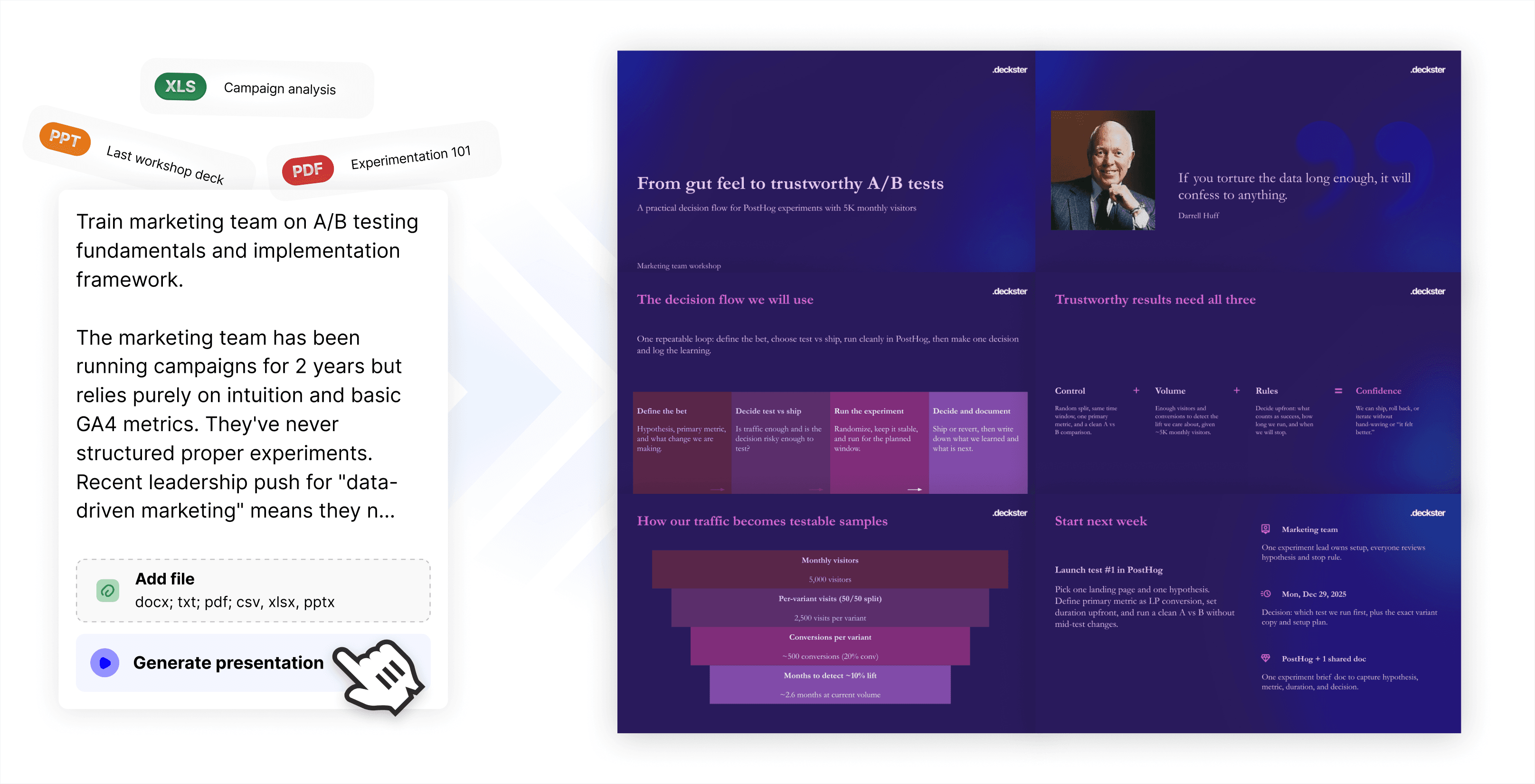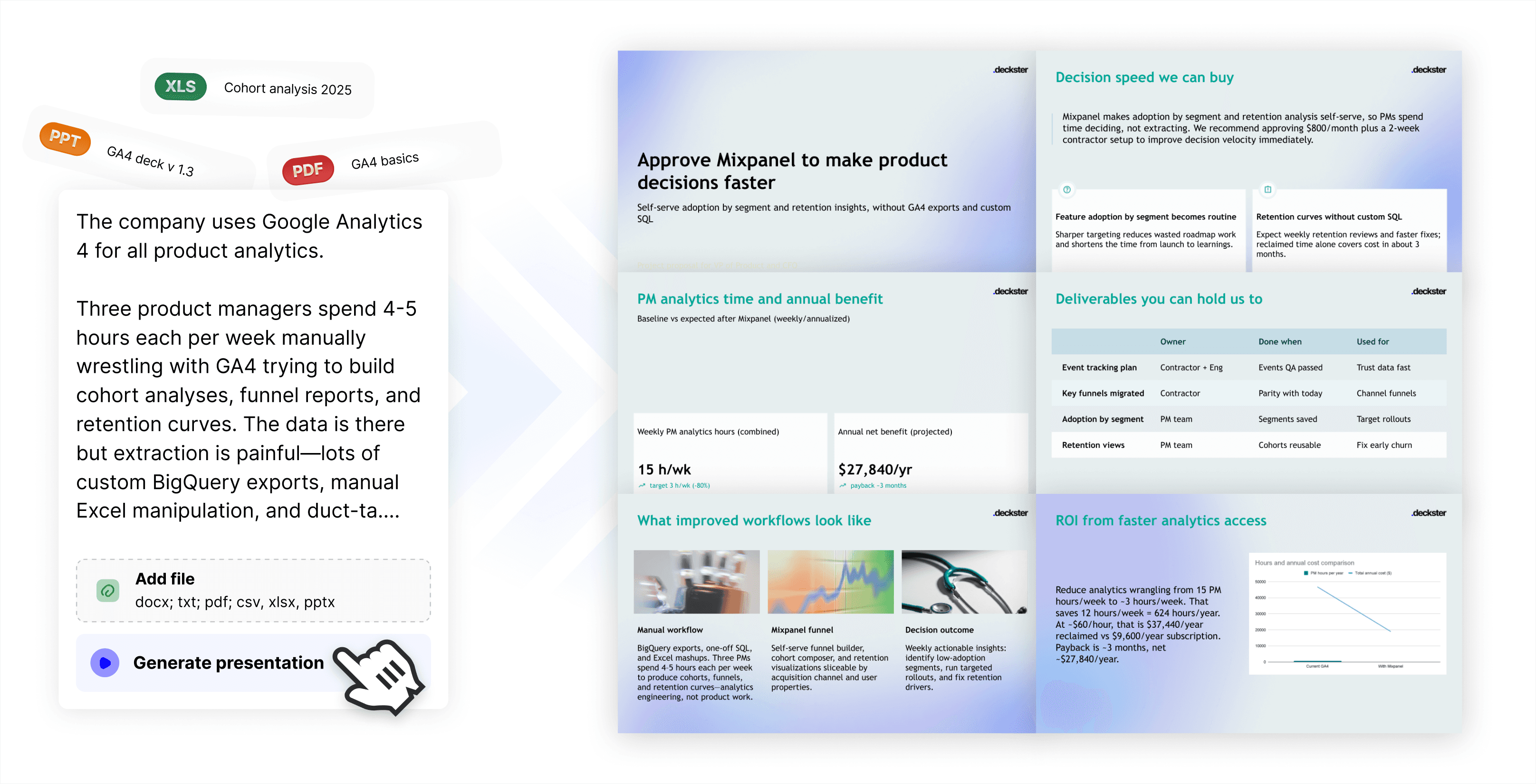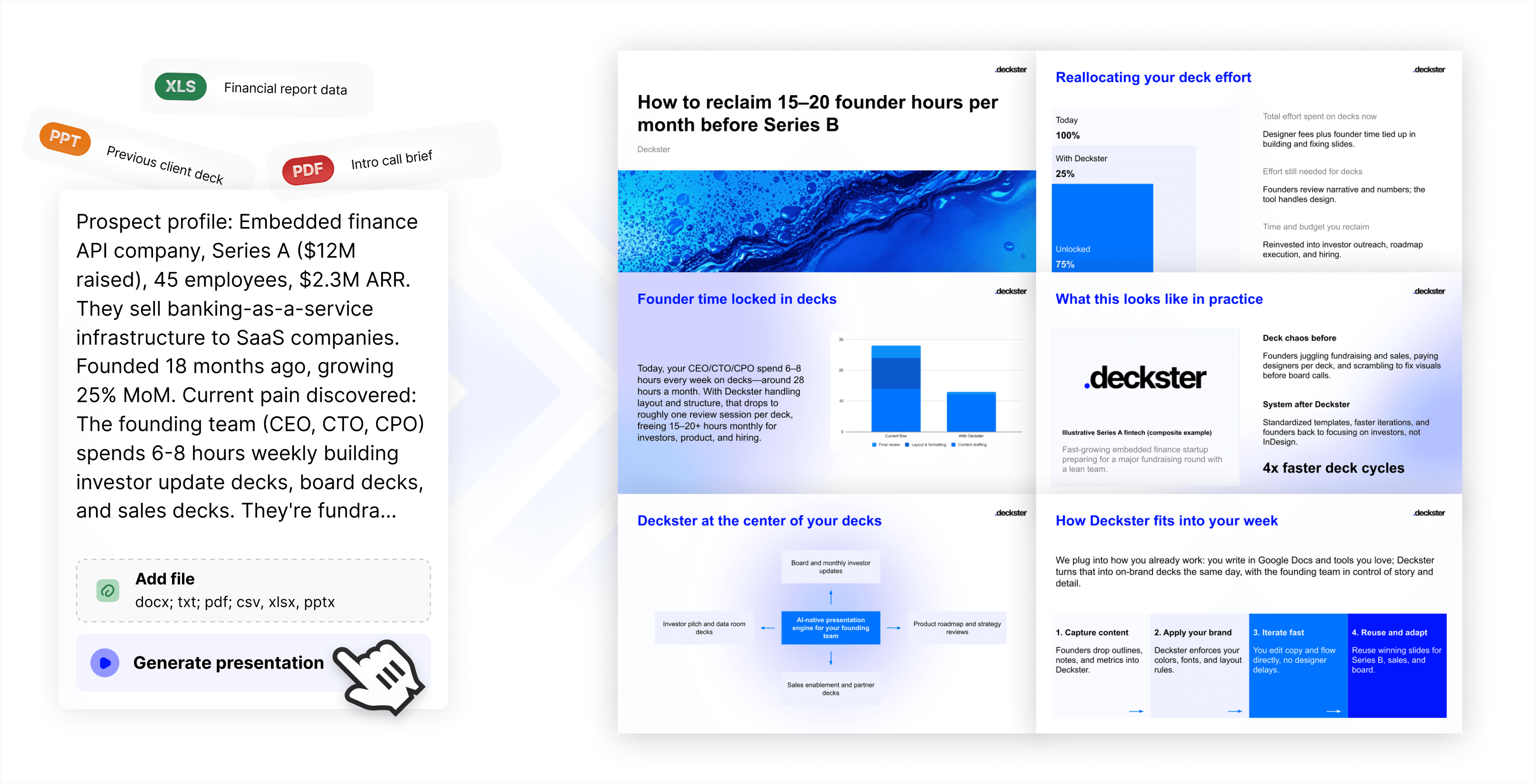 Deckster builds the whole thing - structure, content, charts. You'll get a professional first draft that's 80% there, with mental models and persuasion frameworks already baked in.
