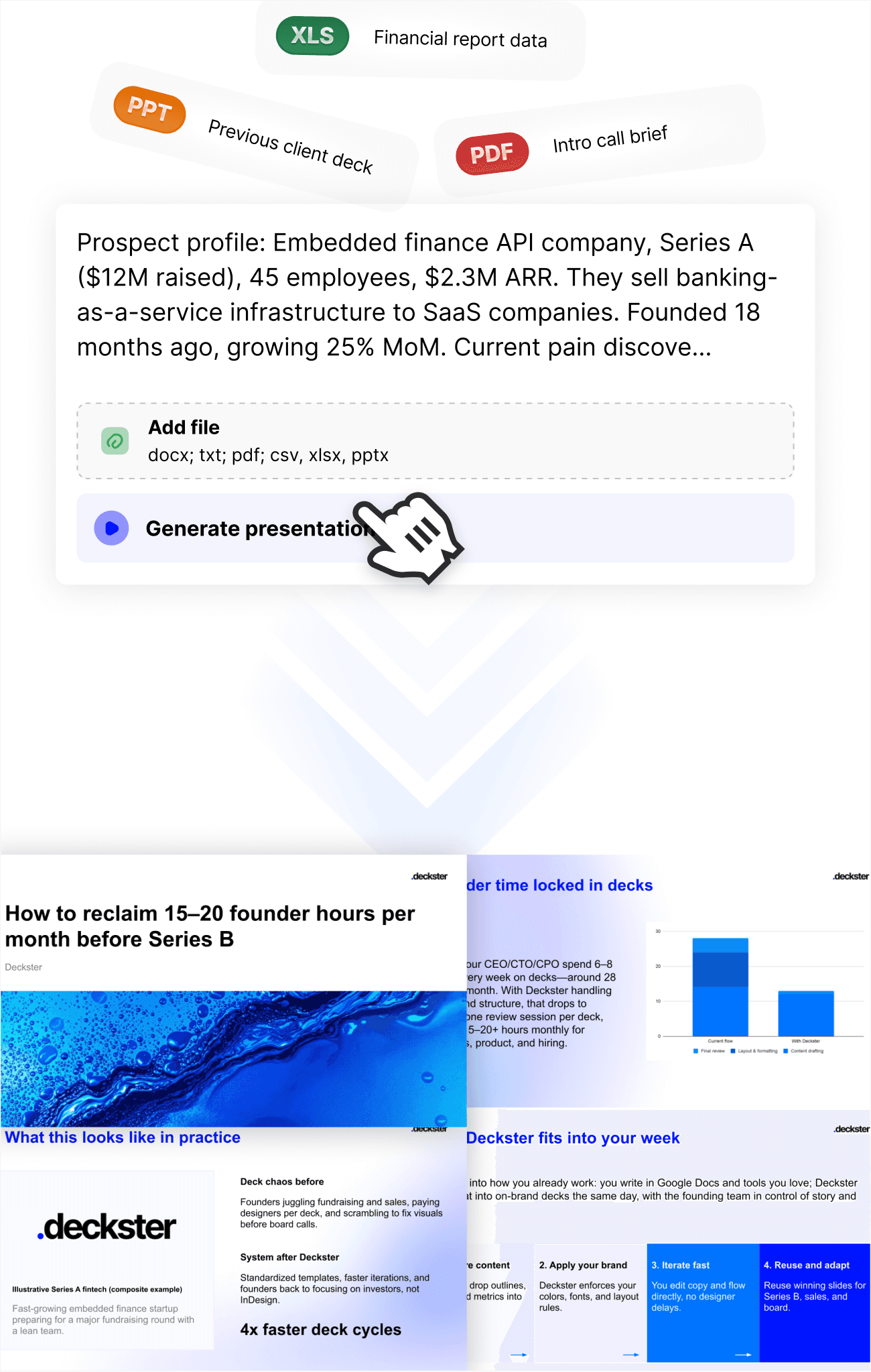 Tell Deckster what you're working on - your goal, who you're presenting to, any key details. Upload files if you have them.