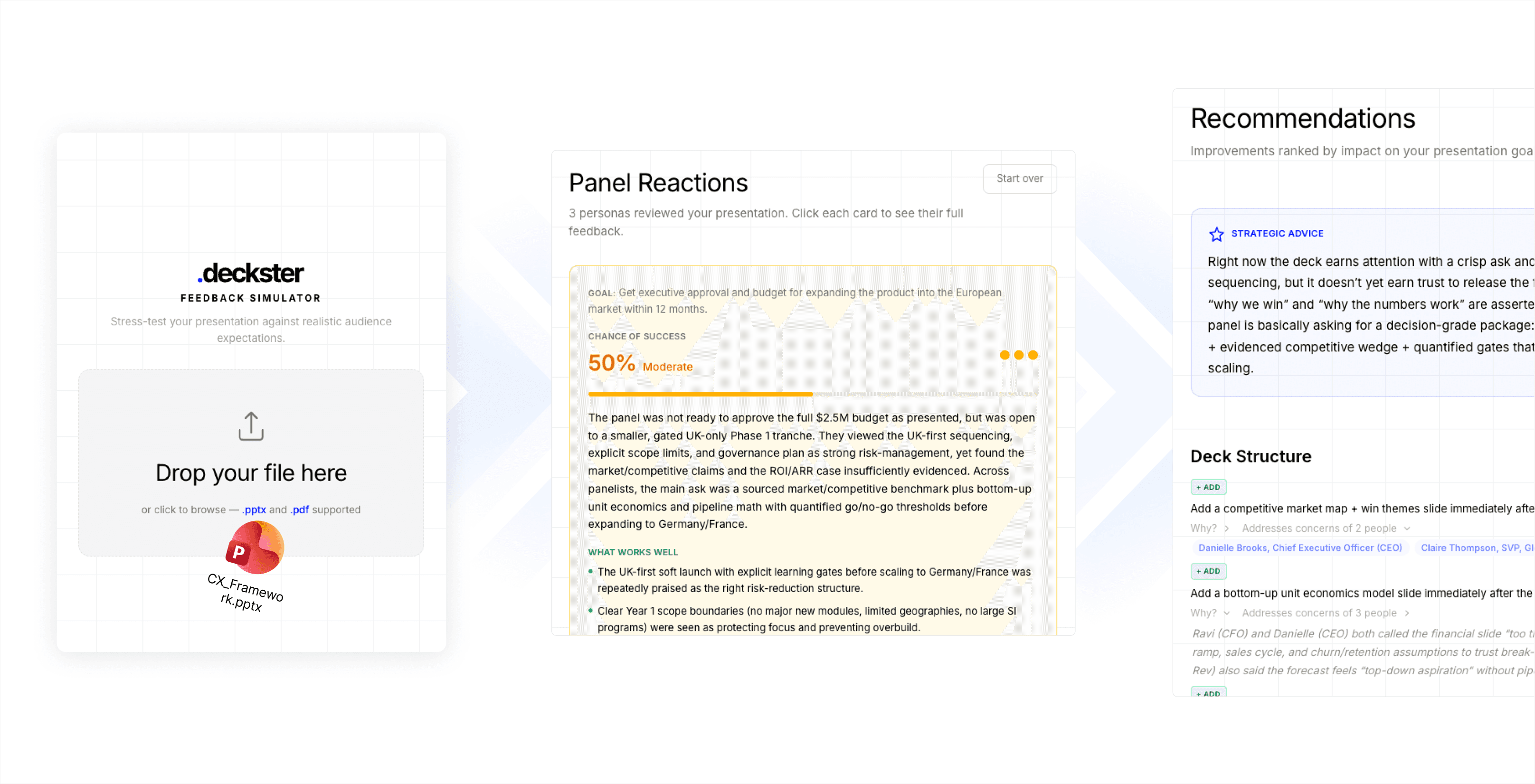 Get a realistic panel of reviewers, each with a distinct role, background, and concerns - built specifically around your presentation goal.