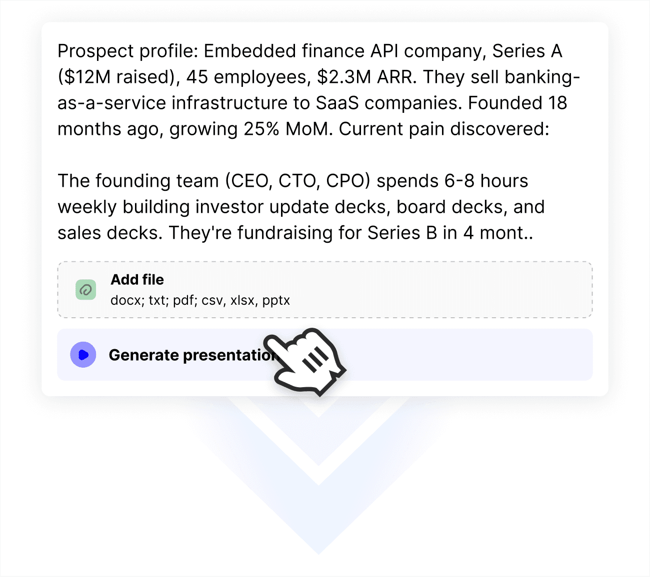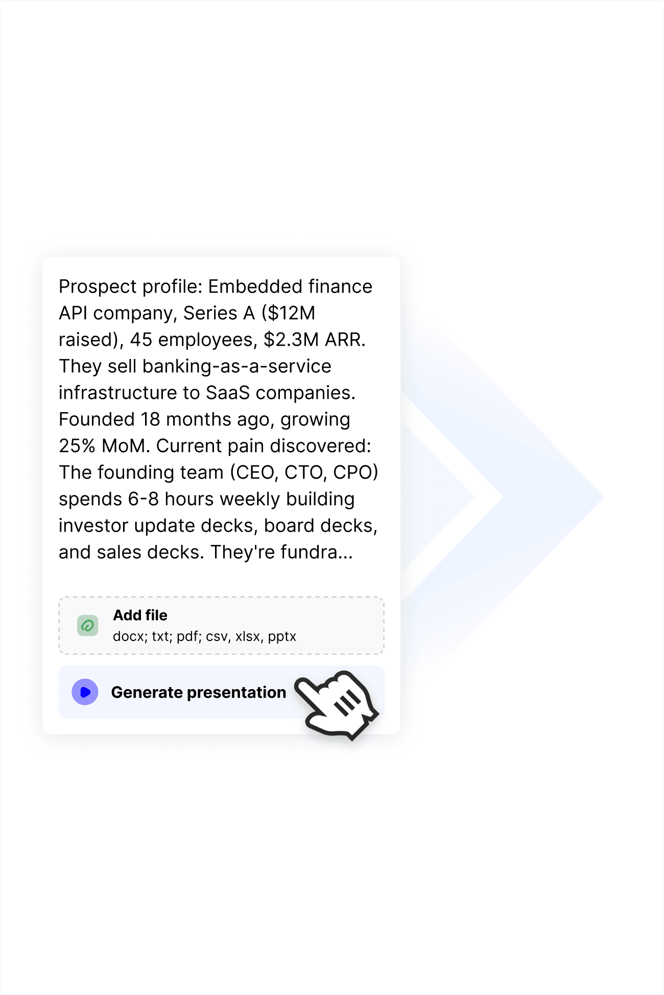 With charts auto-generated from your files (XLSX, CSV), designed to strengthen your argument, not just display information.