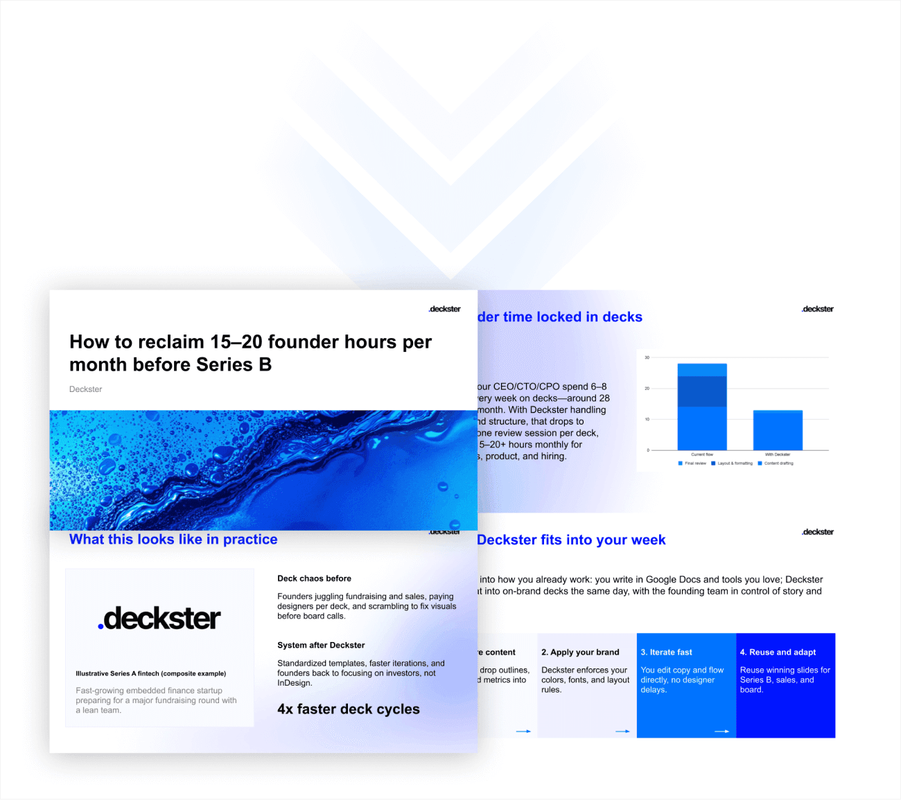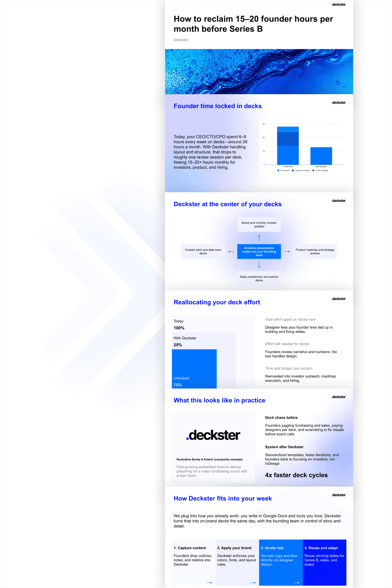 Deckster builds the whole thing - structure, content, charts. You'll get a solid first draft that's 70-80% there, with smart logic and persuasion frameworks already baked in.