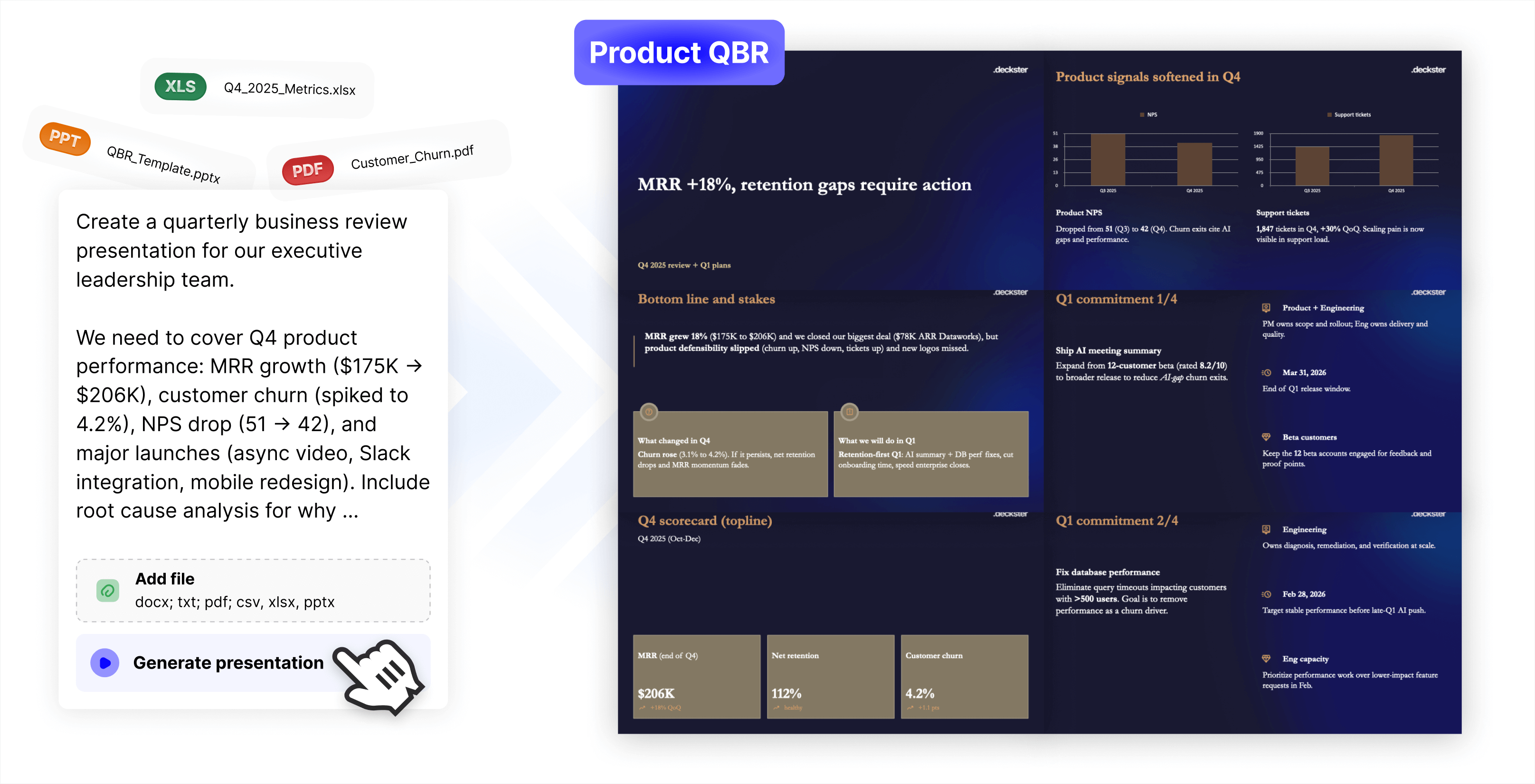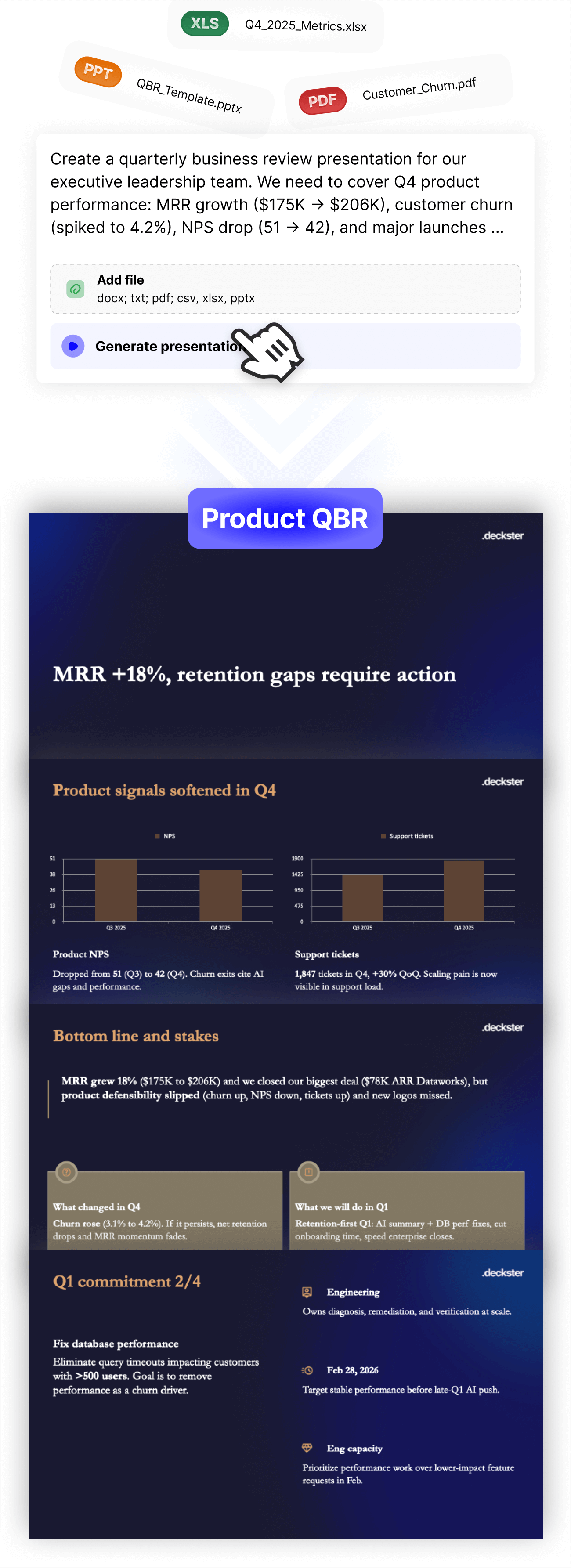 Deckster generates structure, narrative flow, and initial content. Charts auto-created from your data. Frameworks embedded. Not perfect - that's intentional. You'll iterate to 100%.