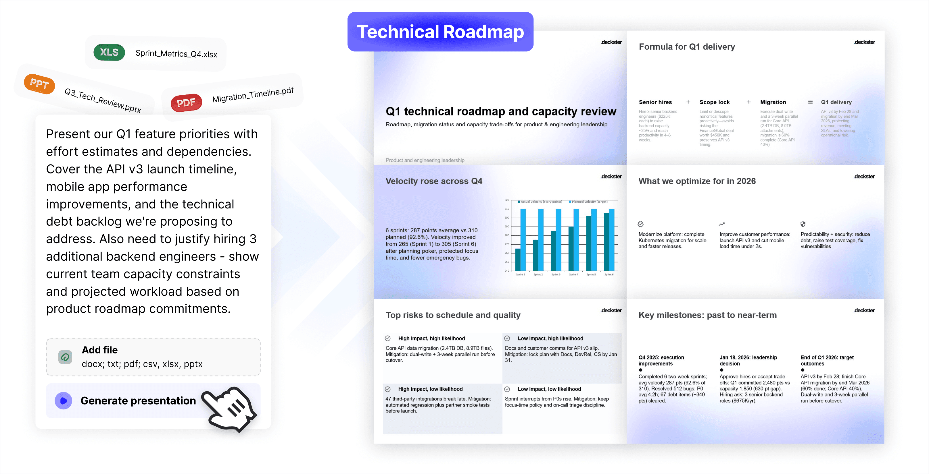 Tell Deckster what you're working on - your goal, who you're presenting to, any key details. Upload files if you have them.
